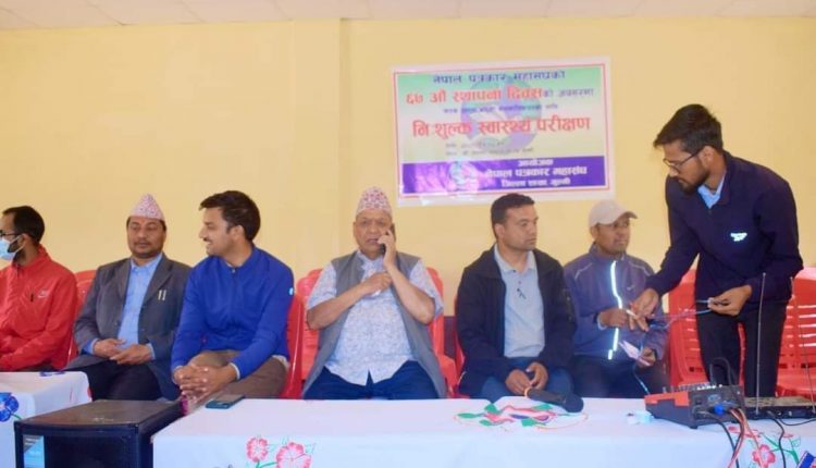 स्वास्थ्य नै मानिसको ठुलो धन भएकाले पत्रकार महासघं गुल्मीले स्थापना दिवसको अवसरमा गरेको निःशुल्क स्वास्थ्य परिक्षण कार्यक्रम एक महत्वपूर्ण र उल्लेखिनीय रहेको कार्यक्रमका प्रमुख अथिति तथा रेसुङ्गा नगरपालिकाका मेयर डिल्लीराज भुसालले बताएका छन् । कार्यक्रममा बोल्दै प्रमुख अथिति मेयर भुसालले पत्रकारको दैनिकी कलम संग जोडिएको र यसमा ठुलो शक्ति भएको बताएका छन् । मेयर भुसालले स्थापना दिवसको सबैमा शुभकामना दिदैँ आर्थिक अभाबमा बिस्थापित नभई पत्रकार ब्याबसायिक बन्न समेत आग्रह गरेका छन् ।
