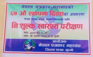 चैत १६, गुल्मी : नेपाल पत्रकार महासघंको ६७ औं स्थापना दिवसको अवसरमा गुल्मीमा फरक क्षमता भएका बालबालिकाको निःशुल्क स्वास्थ्य परिक्षण गरिएको छ । नेपाल पत्रकार महासघं गुल्मीले स्थापना दिवसको अवसरमा उपल्लो तम्घास माध्यमिक बिद्यालयमा अध्यनरत फरक क्षमता भएका बालबालिकाको निःशुल्क स्वास्थ्य परिक्षण गरी आफ्नो स्थापना दिवस मनाएको हो ।