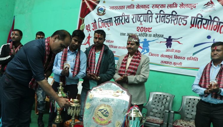 गुल्मी जिल्लाको सदरमुकाम तम्घासमा १२ औं जिल्ला स्तरीय राष्ट्रपति रनिङ शिल्ड प्रतियोगिता सुरु भएको छ । शनिबार गतेदेखि २० गतेसम्म सदरमुकाम तम्घासको चिदिचौर खेलमैदानमा हुने जिल्ला खेलकुद विकास समिति गुल्मीका कार्यालय प्रमुख डिल्ली विश्वकर्माले जानकारी दिनुभयो । विश्वकर्माका अनुसार चिदिचौर खेलमैदानमा हुने प्रतियोगितामा जिल्लाका ११ वटा स्थानीय तहका खेलाडीको सहभागिता भएको बताए ।
