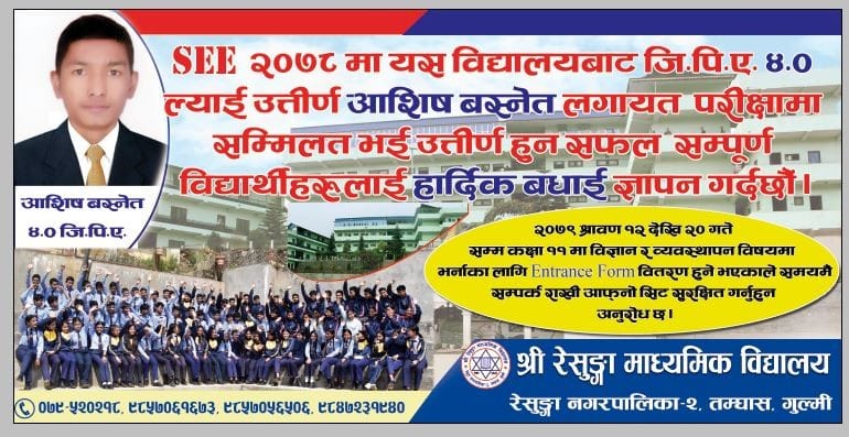 गुल्मीको तम्घास स्थित रेसुङ्गा मा।वि का आशिष बस्नेतले एसइइ परीक्षामा जीपिए ४ ल्याई जिल्ला प्रथम भएका छन्।