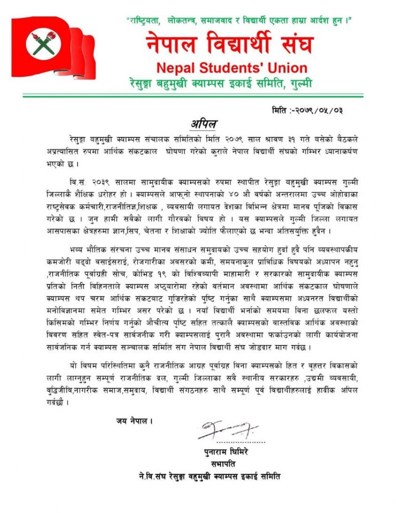 रेसुङ्गा बहुमुखी क्याम्पस इकाई समितिले भव्य भौतिक संरचना उच्च मानव संसाधन समुदायको उच्च सहयोग हुँदा हुदै पनि व्यवस्थापकीय कमजोरी, बढ्दो बसाइसराई, रोजगारीका अवसरको कमी, समानाकुल प्राविधिक विषयको अध्यापन नहुनु, राजनितिक पूर्वाग्रही सोच बाट क्याम्पस गुजिरहेको समयमा क्याम्पसले झन यो सन्र्दभमा आर्थिक संकटकाल घोषण गर्दा विद्यार्थीको भविष्यमा गम्भिर असर परेको रेसुङ्गा बहुमुखी क्याम्पस इकाई समिति सभापति पुनाराम घिमिरेले हस्ताक्षण गरेको अपिल पत्रमा उल्लेख गरिएको छ ।