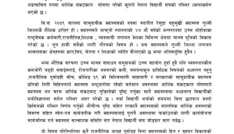 नेपाल विद्यार्थी संघ रेसुङ्गा बहुमुखी क्याम्पस इकाई समितिले रेसुङ्गा बहुमुखी क्याम्पसको वास्तविक आर्थिक अवस्था सार्वजनिक गर्न माग गरेको छ । रेसुङ्गा बहुमुखी क्याम्पस संचालक समितिले गरेको आर्थिक संकटकाल घोषणा गरेको प्रति नेपाल विद्यार्थी संघ गुल्मीले क्याम्पसको निर्णय गलत भएको जनाउदै क्याम्पसको आर्थिक अवस्थाबारे जानकारी गराउन माग गरेको हो ।