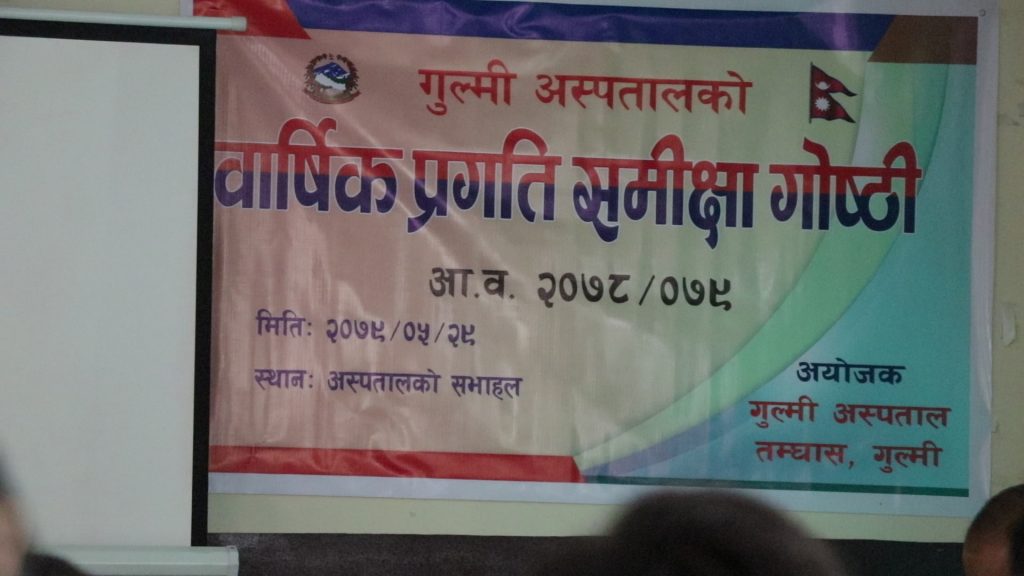 अस्पताल विकास समितिका अध्यक्ष भरत पाण्डेयले प्रदेश स्तरका अस्पताहरु मध्ये आजको आजै रिर्पोट दिने गुल्मी अस्पताल भएको दावी गर्दै जनशक्तिको थप व्यावस्थापन भए सेवा सुधार गर्न सकिने बताए । उनले कम्जोर भौतिक संरचना र कम जनशक्तिकैबिच पनि अहिलेको उपलब्धि निकै सुखद रहेको बताए । पाण्डेयले सवै सरोकारवालासंग समन्वय र संवाद गरेर अस्पतालका अरु सेवाहरुको बिस्तार गरिने बताए । कार्यक्रम अध्यक्ष पाण्डेको अध्यक्षता, समन्वय प्रमुख खत्रीको प्रमुख आतिथ्यता, अस्पतालका व्यावस्थापक असिम चौधरीको स्वागत तथा लेखापाल भिमप्रसाद खनालको संचालनमा सम्पन्न भएको थियो ।