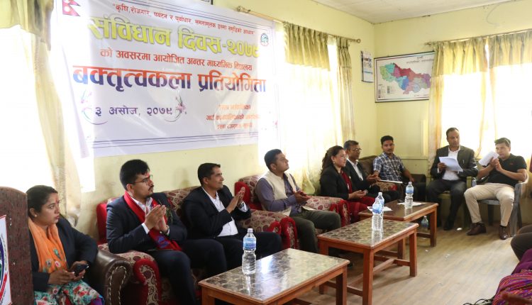 गुल्मी जिल्लाको इस्मा गाउँपालिकाले संविधान दिवसको अवसरमा बक्तृत्वकला प्रतियोगिता कार्यक्रम गरेको छ । गाउँपालिकाले सोमबार एक कार्यक्रमका बिच अन्तर माध्यामिक विद्यालय बक्तृत्वकला प्रतियोगिता आयोजना गरि कार्यक्रम सम्पन्न गरेको हो । गाउँपालिका स्तरीय बक्तृत्वकला प्रतियोगितामा ७ विद्यालयका विद्यार्थीहरुको उपस्थितमा उक्त कार्यक्रम गरिएको हो ।