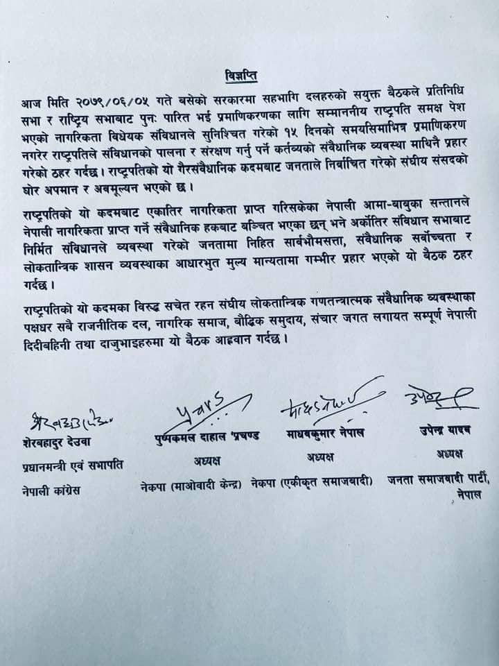 प्रधानमन्त्री निवास बालुवाटारमा आज बिहान बसेको सरकारमा सहभागी दलहरुको संयुक्त बैठकले प्रतिनिधि सभा र राष्ट्रिय सभाबाट पुनः पारित भई प्रमाणिकरणका लागि सम्माननीय राष्ट्रपतिसमक्ष पेश भएको नागरिकता विधेयक संविधानले सुनिश्चित गरेको १५ दिनको समयसिमाभित्र प्रमाणिकरण नगरेर राष्ट्रपतिले संविधानको पालना र संरक्षण गर्नु पर्ने कर्तव्यको संवैधानिक व्यवस्थामाथि नै प्रहार गरेको ठहर गरेको हो।
