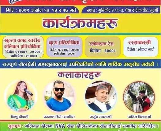 खुल्ला क्लब स्तरीय पुरुष भलिबल प्रतियोगिता, नृत्य प्रतियोगिता, स्लोबाइक रेस प्रतियोगिता र रस्साकस्सी प्रतियोगिता कार्यक्रमहरु आयोजना गरिएको क्लबका अध्यक्ष अशोक सोमैले बताए ।
