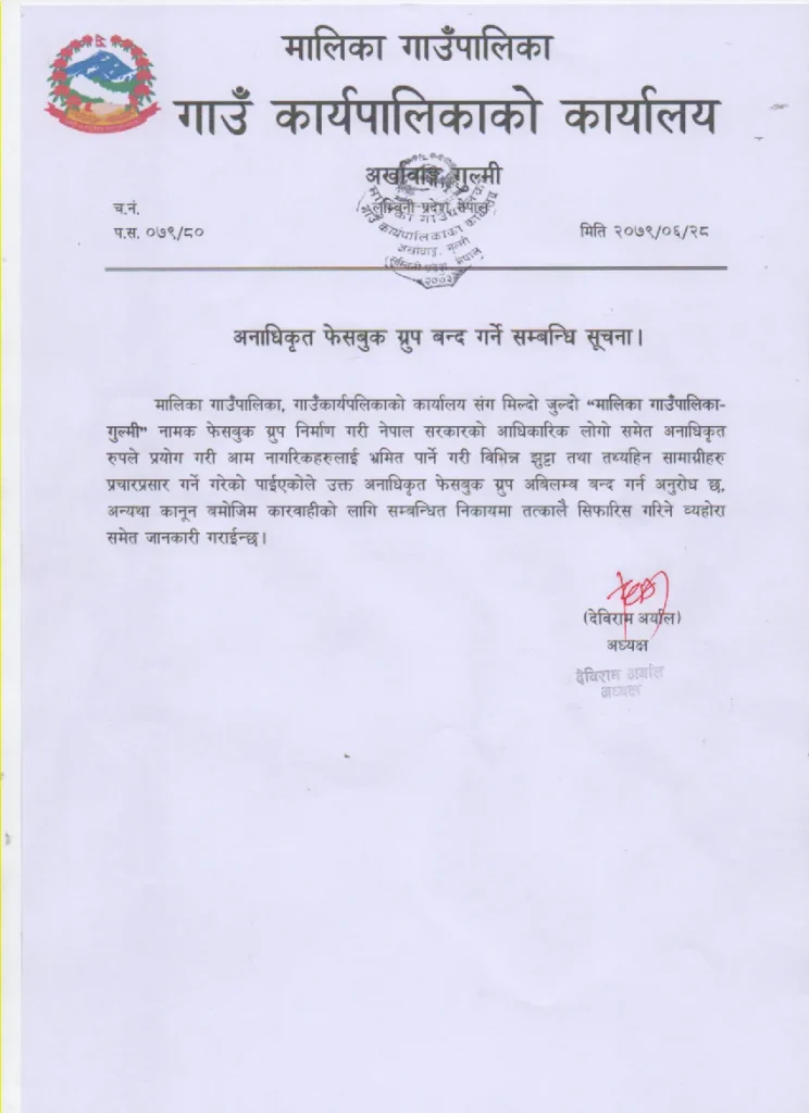गाउँपालिकाका अध्यक्ष देविराम अर्यालले हस्ताक्षर गरेको सूचनामा भनिएको छ ,‶जनतालाई भ्रमित पार्ने विभिन्न झुट्टा तथा तथ्यहिन सामाग्रीहरु प्रचार प्रसार गरिएका कारण गुर्प बन्द गर्न अनुरोध गरिको सूचनामा उल्लेख गरिएको छ ″।