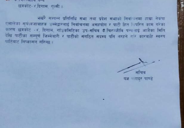 गुल्मी क्षेत्र नम्बर १का उम्मेदवारलाई निर्वाचनमा असहयोग गरेको भन्दै छत्रकोट गाउँपालिकाले गाउँकमिटिका उप–सचिव चिरन्जीवी पन्थलाई पार्टीको संगठित सदस्य पनि नरहने गरि कारवाही स्वरुप पार्टीबाट निष्कासन गरेको एमाले छत्रकोट गाउँपालिका सचिव यज्ञबहादुर पाण्डेले जानकारी दिए ।