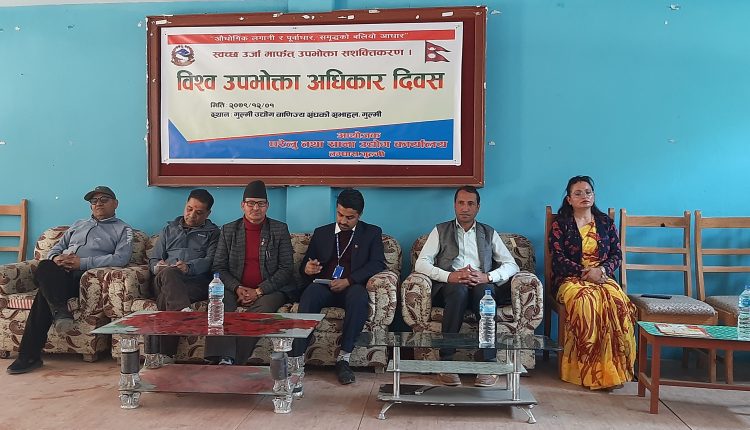 विश्व उपभोक्ता अधिकार दिवस गुल्मीमा पनि मनाइएको छ । औधोगिक लगानी र पुर्वाधार समृद्धको बलियो आधार, स्वच्छ उर्जा मार्फत उपभोक्ता सशसक्तिकरण भन्ने मुल नाराका साथ घरेलु तथा साना उद्योग कार्यालय गुल्मीको आयोजनामा दिवस मनाइएको हो ।गुल्मी उद्योग वाणिज्य संघ गुल्मीको सभाहलमा भएको कार्यक्रममा बोल्ने अधिकांश बक्ताहरुले दैनिक उपभोग्य बस्तुको प्रयोग गर्ने उपभोक्ताहरु नै बढी सचेत हुनुपर्नेमा जोड दिएका छन् । गुल्मी उद्योग संघका उपाध्यक्ष जनक पन्तले विश्व उपभोक्ता दिवस नारामा मात्रै सीमित हुन नहुनेमा जोड दिएका छन् । उनले बजारमा म्याद गएका सामानहरु विक्री भइरहेको अवस्थामा पनि सरोकारवाला निकायहरु मौन रहनु दुःखद भएको बताएका छन् । गुल्मी चेम्वर अफ कमर्शका अध्यक्ष दुर्गाप्रसाद पाण्डेले उपभोक्ताहरु बढीसचेत हुनुपर्ने र सचेतनाका कार्यक्रमहरु गर्नुपर्नेमा जोड दिए । महिला उद्यमीसंघ गुल्मीकी नेतृ निर्मला केशीले सबै नागरिकहरु सचेत रहनुपर्ने भन्दै महिलाहरु बढी आत्म निर्भर बन्नका लागि सीपमूलक तालिमहरुको ब्यबस्था संगै उद्यमी बन्नुपर्नेमा जोड दिइन् ।