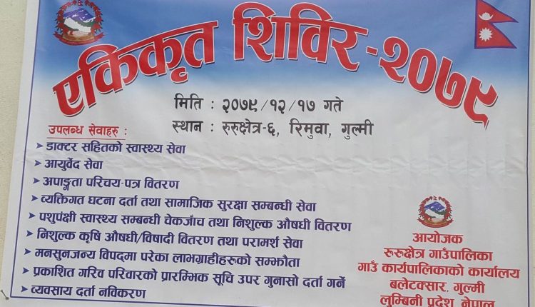 गुल्मी, १८ चैत । गुल्मीको रुरुक्षेत्र गाउँपालिकाले एकीकृत घुम्ती शिविर सम्पन्न गरेको छ । गाउँपालिकाको वडा नम्बर ६ रिमुवामा सम्पन्न शिविरमा डाक्टरसहितको स्वास्थ्य सेवा, आयुर्वेद सेवा, अपाङ्गता परिचय पत्र वितरण, व्यक्तिगत घटना दर्ता तथा सामाजिक सुरक्षा सम्बन्धी सेवा प्रदान गरिएको थियो । त्यस्तै पशुपंक्षी स्वास्थ्य सम्बन्धी चेकजाँच तथा निस्शुल्क औषधी वितरण, निस्शुल्क कृषि औषधीरविषादी वितरण तथा परामर्श, मनसुनजन्य विपद्मा परेका लाभग्राहीहरुको सम्झौता, प्रकाशित गरिव परिवारको प्रारम्भिक सूचि उपर गुनासो दर्ता र व्यवसाय दर्ता नविकरण सेवा उपलब्ध गराइएको थियो ।