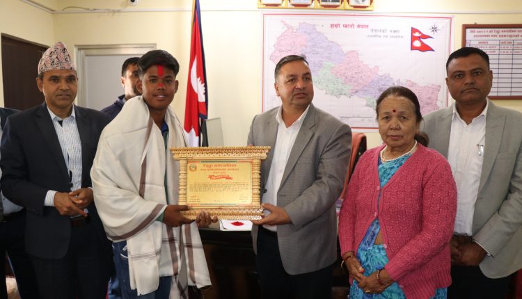 २३ चैत, गुल्मी । गुल्मी जिल्लाको रेसुङ्गा नगरपालिकाले १९ वर्ष मुनीको नेपाली राष्ट्रिय क्रिकेट टिमका खेलाडी अर्जुन कुमाललाई सम्मान गरेको छ । क्रिकेट खेलाडी कुमाललाई बिहिवार एक कार्यक्रमका बिच नगरप्रमुख खिलध्वज पन्थीले नगद ३० हजार सहित सम्मान गर्नु भएको हो ।