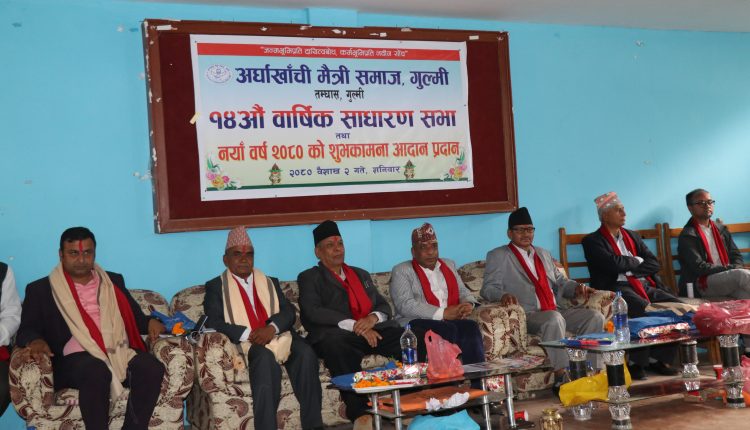 अर्घाखाँची मैत्री समाज गुल्मीले १४ औँ वार्षिक साधारण सभा कार्यक्रम गरेको छ । शनिबार गुल्मीको सदरमुकाम तम्घासमा नयाँ वर्ष २०८० को शुभकामना आदान प्रदान गरि कार्यक्रम गरेको हो । जन्मभूमिप्रति दायित्वबोध, कर्मभूमिप्रति नवीन सोच भन्ने नाराका साथ समाजले कार्यक्रम गर्दै आएको छ ।