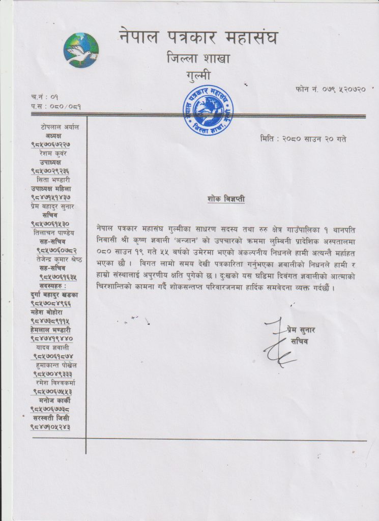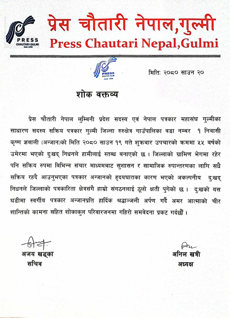 नेपाल पत्रकार महासंघ जिल्ला शाखा गुल्मीका साधारण सदस्य समेत रहेका रुरुक्षेत्र गाउँपालिका १ निवासी कृष्ण ज्ञवाली (अन्जान) ले जिल्लाको ग्रामिण भेगमा रहेर पनि सक्रिय रुपमा विभिन्न संचार माध्यमबाट सुशासन र सामाजिक रुपान्तरणका लागि सधै सक्रिय रहदै आउनुभएको योगदान कहिलै बिर्सिन नसकिने शोक वक्तव्यमा उल्लेख गरिएको छ ।