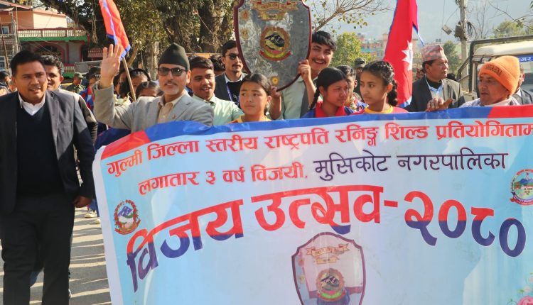 गुल्मी जिल्लाको मुसिकोट नगरपालिकाले जिल्ला स्तरीय राष्ट्रपति रनिङ शिल्ड प्रतियोगीतामा विजयी भई रनिङ शील्ड जितेको खुसीयालीमा मुसिकोट नगरपालिकाले विजय उत्सव मनाएको छ । लगातार ३ पटक विजयी भई रनिङ शील्ड जितेको विजय उत्सव मनाएको छ ।
