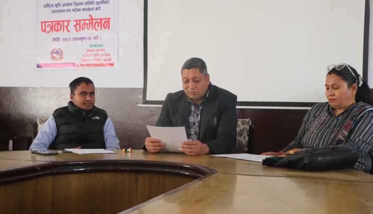 समितिले पछिल्लो साढे दुई वर्षको अवधिमा गरिएको कार्यविवरण राष्ट्रिय भूमि आयोग जिल्ला समिति गुल्मीले मंगलबार पत्रकार सम्मेलन गर्दै जानकारी दिएको हो । भूमिहीन सुकुम्वासी र अव्यवस्थितलाई जग्गा वितरण गर्नु पूर्व दिइने एक प्रकारको प्रमाण निस्सा रहेको छ ।