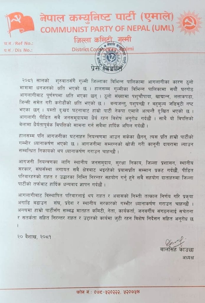 २१ वैशाख, गुल्मी । नेकपा एमाले गुल्मीले आगोलागीका घटनाहरु बढ्दै गएकाले पार्टीसँग सम्बद्ध मातहत कमिटी, नेता, कार्यकर्ता, जनवर्गीय संगठनलाई सचेतना र सतर्कता सहित निरन्तर राहत र उद्दारको कार्यमा जुटन विशेष अनुरोध गरेको छ । बिहीबार पार्टी अध्यक्ष बालसिंह काउछाद्धारा जारी विज्ञप्ति आगलागी पीडितको आवस निर्माण गर्न संघ, प्रदेश र स्थानीय सरकारको गम्भीर ध्यानाकर्षण गराएको छ ।