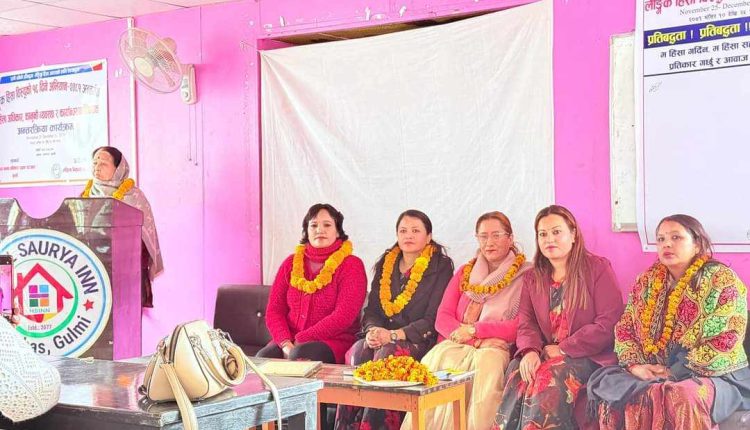 महिला विकास मन्च गुल्मीको आयोजनामा महिला अधिकार, कानुनी ब्यवस्था र कार्यान्वयन विषयक अन्तरक्रिया कार्यक्रम तम्घासमा सम्पन्न भएको छ ।कार्यक्रमका सहभागीहरुले हिम्सा पीडित महिलाहरूको पुनर्स्थापनामा राज्य जिम्मेवार बन्नुपर्नेमा जोड दिएका छन् ।कार्यक्रममा गुल्मी जिल्ला अदालत बार एशोसियसन गुल्मीका अध्यक्ष अधिवक्ता गोपालप्रसाद खनालले मुलुकी देवानी संहिता २०७४ ले महिला अधिकारको क्षेत्रमा गरेका मुख्य ब्यवस्था र जिल्ला सरकारी वकिल कार्यालयका सहायक जिल्ला न्यायाधिवक्ता मीना थापाले मुलुकी फौजदारी संहिता २०७४ का कानुनी ब्यवस्था र कार्यान्वयनका विषयमा सहजीकरण गर्नुभएको थियो ।